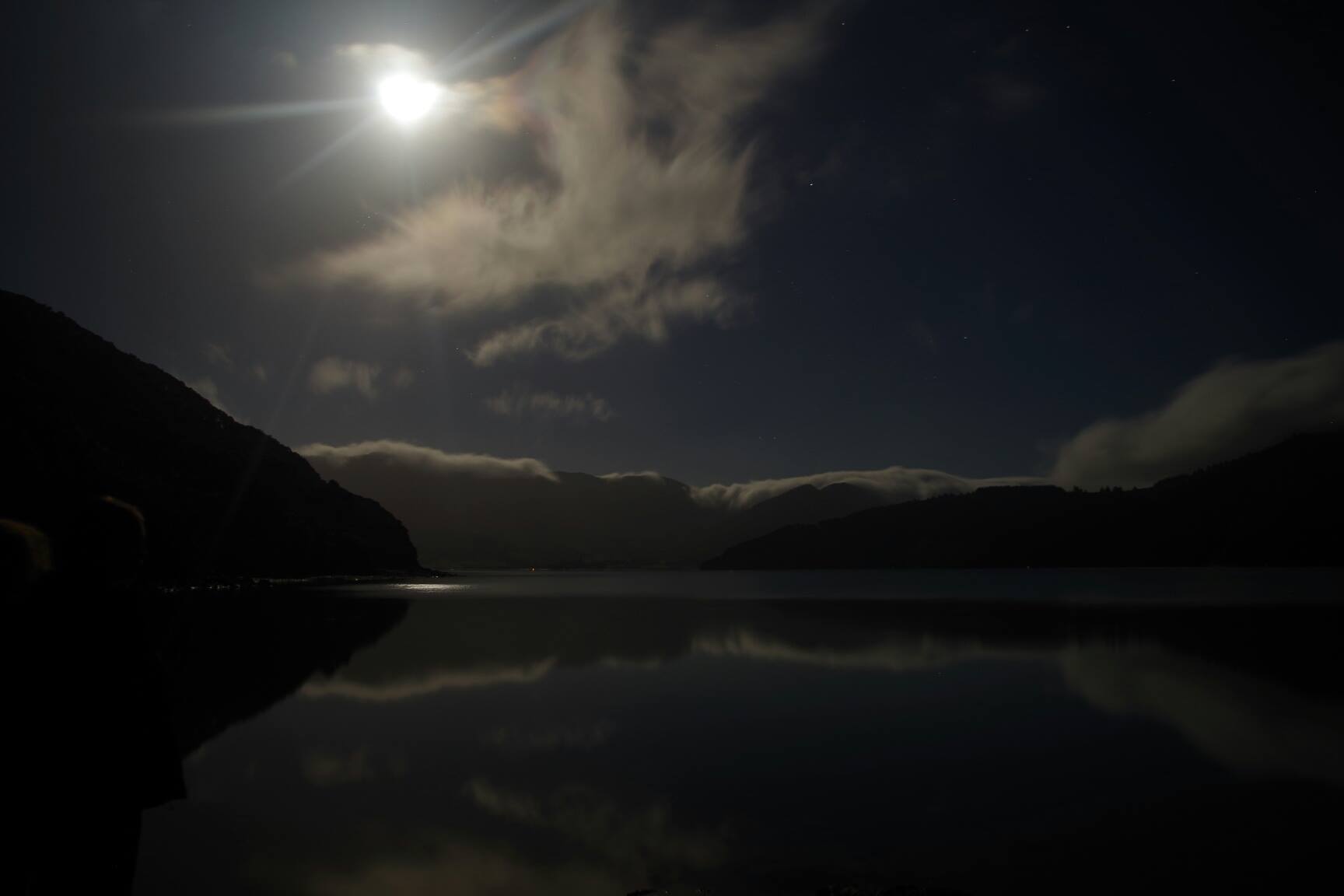 Der Trip zu dritt war noch einmal eine ganz neue Form von diesem meditativen Bewusstseinszustand, den Neuseeland im Inneren vieler lange Reisender auslösen kann. Es gibt eine Karte von Campingplätzen, die nur zu dem Zweck existierten, für eine freiwillige Spende an abgelegenen Orten seine Zeit zu verbringen. Der erste, den wir so anfuhren, lag inmitten der wildesten Natur. Wir erreichten ihn erst um Mitternacht am nächsten Tag. Eine schmale, sich schlängelnde Straße führte dorthin. Die letzten zwei Kilometer wurden wir von einem suizidalen Hasen geradewegs zum Campingplatz geleitet, der Haken schlagend vor dem Bus hin und her raste. Egal was wir versuchten, half nicht, um ihn zu vertreiben. Wir löschten das Licht, blieben stehen, stiegen aus und rannten auf ihn zu. Er schlug unbeirrt seine Haken und wir tuckerten mit 7 Km/h Tränen lachend hinter ihm her. Der Campingplatz bestand aus insgesamt drei! Stellplätzen in einer Straßenbucht. Es gab eine Toilette und einen Wasserhahn, mehr brauchten wir mit unserem Porno-Bus aber auch nicht, um tagelang untertauchen zu können. Ein kleiner Pfad führte zu einem atemberaubenden See hinab, der allerdings aus Salzwasser bestand, da er vom Meer in eine von Bergen umgebene Bucht hinein floss. Um uns herum waren also Dschungel, Berge und dieser gespenstisch spiegelglatte See. Vier Nächte und Tage lebten wir dort, als würde es kein Morgen geben. Wir lasen uns gegenseitig Faust vor, diskutierten darüber „was die Welt im Innersten zusammen hält“, kochten, badeten, sonnten uns und machten Musik. Eines Nachts schlief Lydia früh ein und Marlene und ich waren unabhängig voneinander noch wach im Bus gelegen. Unsere Blicke trafen sich und wir schlichen leise gemeinsam zum See hinunter. Der Anblick war so unwirklich, dass wir uns bemühten ein Nacht-Foto davon hinzubekommen. Der Mond stand taghell über der Seespiegelfläche, auf der kein einziger Windhauch zu sehen war.